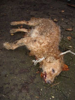 Dieser Hund wurde erdrosselt im Hackenbroicher Waldstück gefunden am 05.01.08.  Sachdienliche Hinweise bitte an das Tierheim Dormagen www.tierheim-dormagen.de  |