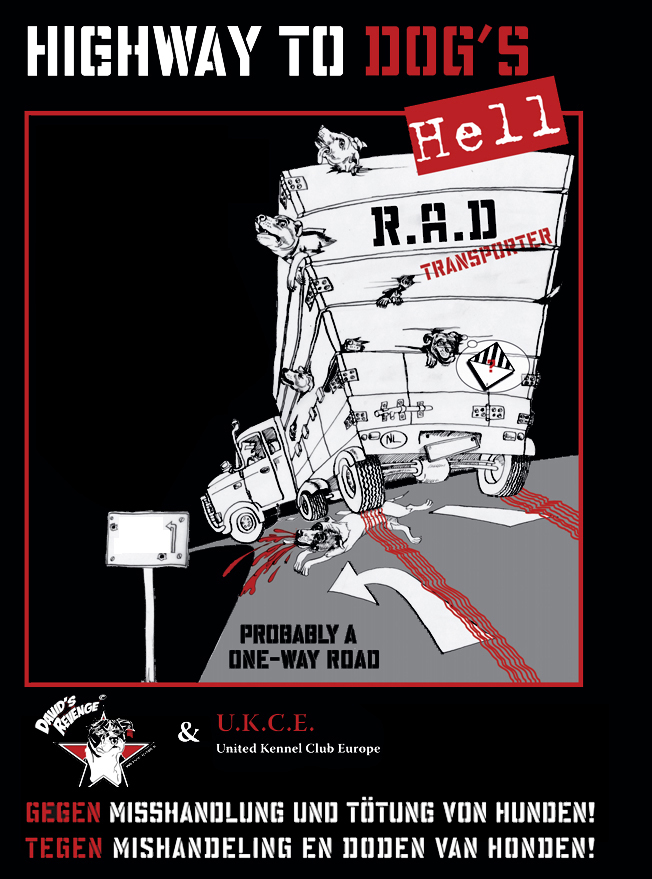 Louterbloemen behauptet, dass hier die RAD Hunde nur immer kurz, also Stunden, Tage und wenige Wochen gelagert werden, um Schauungen stattfinden zu lassen und dann wieder in die anderen nierderländischen Laserasiele verfrachtet werden. Dies ermutigte mich diese Information auch in einem Plakat zu visualisieren. Dem Highway to dog's Hell Plakat.